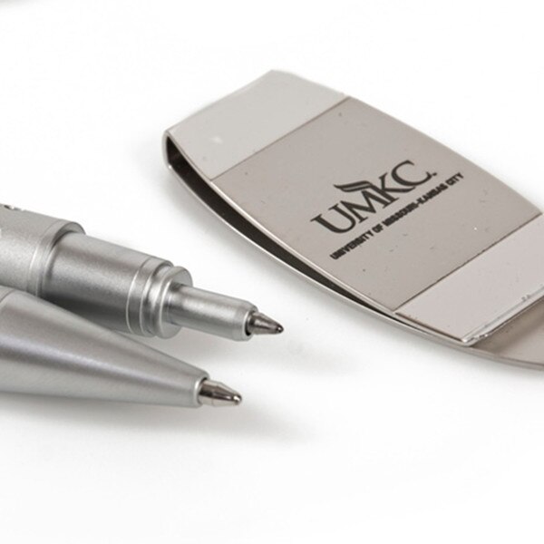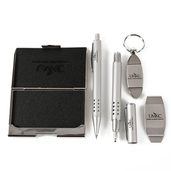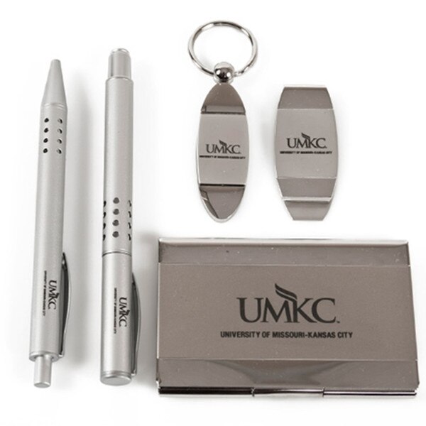 Elevate your professional style with the sleek and sophisticated UMKC Executive Gift Set, a premium 5-piece collection perfect for alumni, graduates, or business professionals with Roo pride. Each item in this matching silver-toned set is elegantly etched with the University of Missouri–Kansas City logo for a polished and unified look.